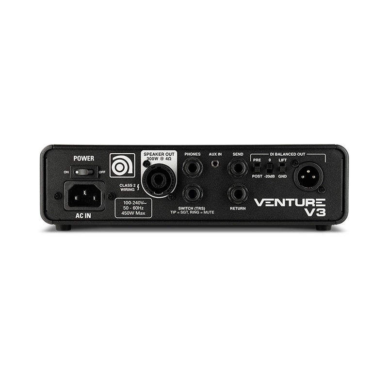 The ultra-portable 300-watt Venture V3 is the smallest and lightest of the three heads in the Venture Series and easily fits into a gig bag, a laptop bag, or the optional Venture carrying bag, making it an excellent choice for the travelling bassist. Its Class D power section provides more than enough power to drive any of the Venture Series speaker cabs or practically any other cab bassists may encounter while touring.